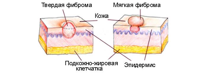 Фибромы могут возникать на любой части тела. Место возникновения опухоли зависит от ее вида. Различают мягкую и твердую фиброму кожи.