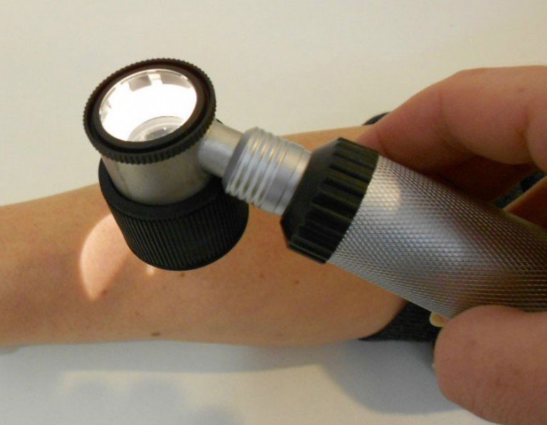 - Дерматоскопическое исследование, позволяющее выявить происхождение образования;