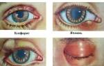 Если сравнить радужку здорового и больного глаза, то видно что на больном глазу радужка мутная, нет характерного рисунка углублений — крипт радужки, в ней видны расширенные сосуды. Вследствие отека ткани радужки происходит сужение зрачка, которое тоже особенно заметно при сравнении больного и здорового глаза.
